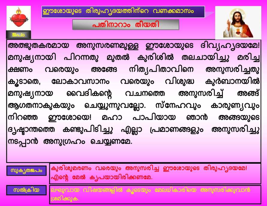 - ഞങ്ങൾക്കെല്ലാവർക്കും സിദ്ധിച്ചിരിക്കുന്ന നന്മകളുടെ സമ്പൂർണനിധിയായ ഈശോയുടെ തിരുഹൃദയമേ,