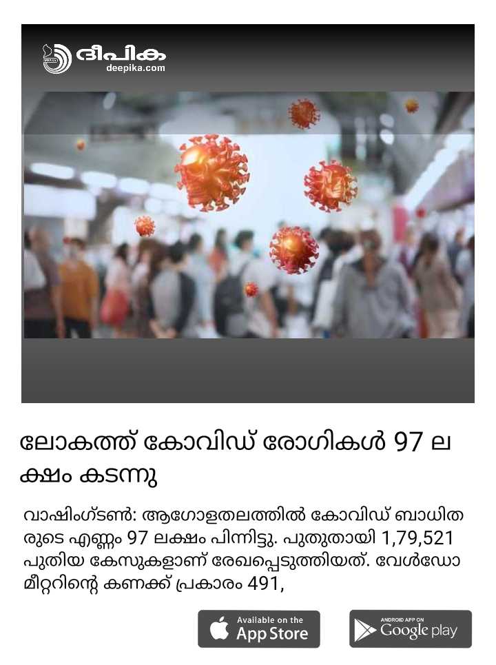 ലോ​ക​ത്ത് കോ​വി​ഡ് രോ​ഗി​ക​ൾ 97 ല​ക്ഷം ക​ട​ന്നു