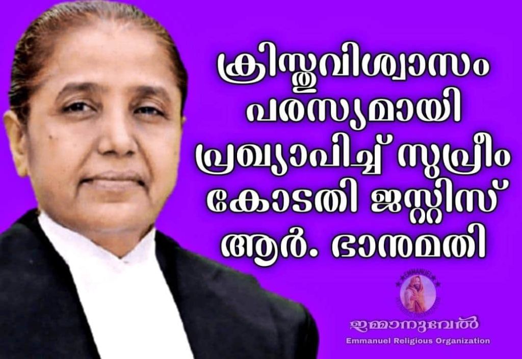 ന്യൂഡൽഹി: വ്യക്തിജീവിതത്തിൽ യേശുക്രിസ്തു ചെലുത്തിയ സ്വാധീനവും ക്രിസ്തുവിലുള്ള തന്റെ വിശ്വാസവും പരസ്യമായി പ്രഖ്യാപിച്ച് സുപ്രീംകോടതി ജസ്റ്റിസ് ആർ. ഭാനുമതി.