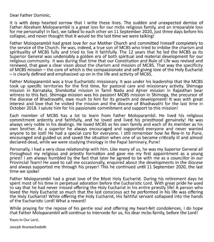 Homage to Fr Abraham Moloparambil MCBS by Bishop Mar Joseph Arumachadathu MCBS, Bishop of the Diocese of Bhdravathy