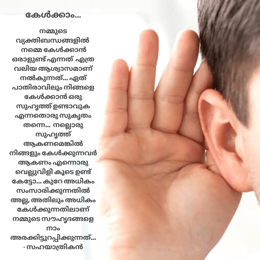 നമ്മുടെ വ്യക്തിബന്ധങ്ങളിൽ, നമ്മെ കേൾക്കാൻ ഒരാളുണ്ട് എന്നത് എത്ര വലിയ ആശ്വാസമാണ് നൽകുന്നത്… ഏത് പാതിരാവിലും നിങ്ങളെ കേൾക്കാൻ ഒരു സുഹൃത്ത് ഉണ്ടാവുക എന്നതൊരു സുകൃതം തന്നെ… നല്ലൊരു സുഹൃത്ത് ആകണമെങ്കിൽ നിങ്ങളും കേൾക്കുന്നവർ ആകണം എന്നൊരു വെല്ലുവിളി കൂടെ ഉണ്ട് കേട്ടോ… കുറേ അധികം സംസാരിക്കുന്നതിൽ അല്ല, അതിലും അധികം കേൾക്കുന്നതിലാണ് നമ്മുടെ സൗഹൃദങ്ങളെ നാം അരക്കിട്ടുറപ്പിക്കുന്നത്…
