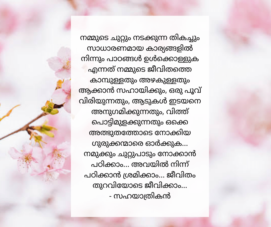 നമ്മുടെ ചുറ്റും നടക്കുന്ന തികച്ചും സാധാരണമായ കാര്യങ്ങളിൽ നിന്നും പാഠങ്ങൾ ഉൾക്കൊള്ളുക എന്നത് നമ്മുടെ ജീവിതത്തെ കാമ്പുള്ളതും അഴകുള്ളതും ആക്കാൻ സഹായിക്കും, ഒരു പൂവ് വിരിയുന്നതും, ആടുകൾ ഇടയനെ അനുഗമിക്കുന്നതും, വിത്ത് പൊട്ടിമുളക്കുന്നതും ഒക്കെ അത്ഭുതത്തോടെ നോക്കിയ ഗുരുക്കന്മാരെ ഓർക്കുക… നമുക്കും ചുറ്റുപാടും നോക്കാൻ പഠിക്കാം… അവയിൽ നിന്ന് പഠിക്കാൻ ശ്രമിക്കാം… ജീവിതം തുറവിയോടെ ജീവിക്കാം…
