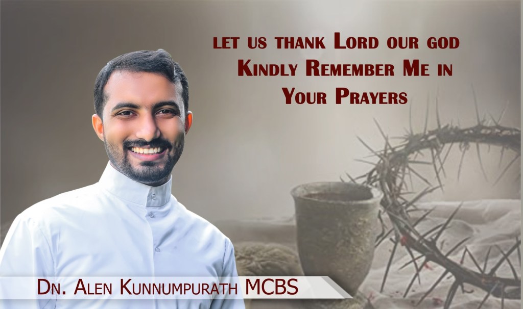 I am Dn. Alen Kunnumpurath MCBS. I am very glad to inform you about my Priestly Ordination. I will be ordained by His Excellency Bishop Mar George Njaralakatt, Archbishop of Thalassery Archdiocese at 10.30am on 28th December 2020 at my Home Parish, Little Flower Forane church, Vellarikkundu. Please do remember me in your prayers. Thank you very much.