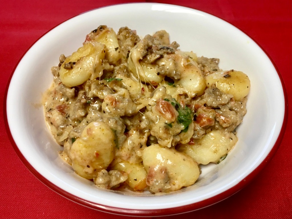 This one pan meal is absolutely fantastic and one of my favorite meals! If you have never tried Gnocchi, it is usually made from potatoes and it is a type of dumpling. Normally they are cooked in boiling water but with this recipe they are not. I made this with hot Italian sausage and it was amazing but you can also use mild sausage, whatever your prefer.