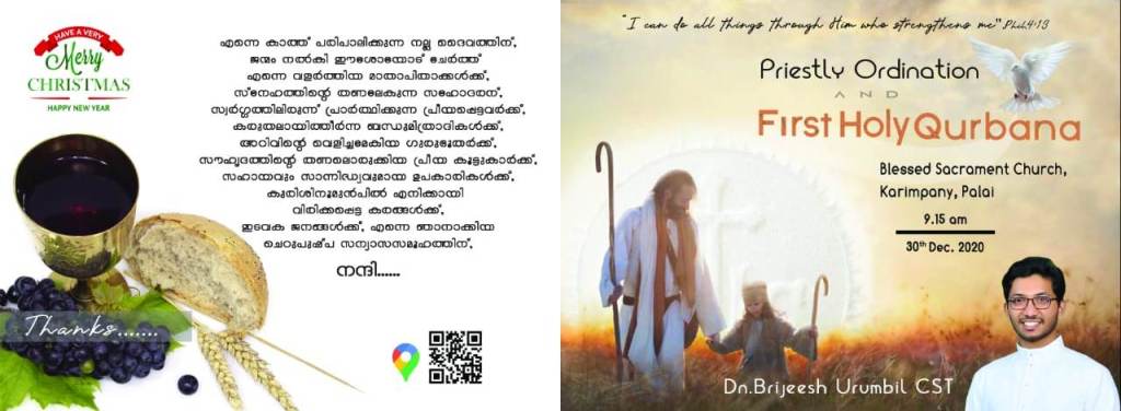 ദൈവകൃപയാൽ ഈ വരുന്ന ഡിസംബർ മുപ്പതാം (30) തിയതി രാവിലെ 9 :15 നു അഭിവന്ദ്യ മാർ ജേക്കബ് മുരിക്കൻ പിതാവിന്റെ കൈവയ്പ്പ് വഴി ഞാൻ ശുശ്രൂ ഷാപൗരോഹിത്യം സ്വീകരിക്കുകയാണ്… ഈ തിരുക്കർമങ്ങൾ വളരെ ഭംഗിയാകുന്നതിനായി പ്രാർത്ഥിക്കണേ … പ്രാർത്ഥനയിൽ എന്നെയും കൂടെ പ്രത്യേകം ഓർക്കണേ…