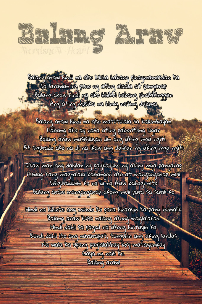 Balang araw hindi na ako luluha habang pinagmamasdan ka Sa larawan ng puno ng ating alaala at pangarap Balang araw hindi na ako hihikbi habang pinakikinggan Ang ating musika na himig nating dalawa Balang araw hindi na ako matutulala sa kalumbayan Habang ako ay nasa ating paboritong lugar Balang araw masisilayan din ang aking mga ngiti At sigurado ako na di na ikaw ang dahilan ng aking mga ngiti Ikaw man ang dahilan ng pagkaguho ng aking mga pangarap Huwag kang mag-alala babangon ako at mangangarap muli Sisiguraduhin ko na di na ikaw bahagi nito Balang araw mangangarap akong muli para sa sarili ko Hindi na hihinto ang mundo ko para hintayin ka pang bumalik Balang araw kusa nalang akong maglalakad Hindi dahil sa pagod na akong hintayin ka Kundi dahil ito ang nararapat, tunguhin ang aking landas Na wala ka upang paglalakbay ko’y matagumpay Gaya ng nais ko. Balang…