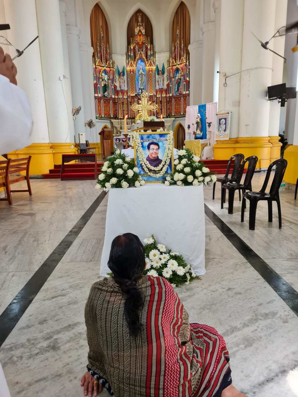 (കോവിഡ് മൂലം മരണമടഞ്ഞ ബഹു. മാത്യു കുമ്പളത്തുപറമ്പിൽ OCD അച്ചൻ്റെ മൃതശരീരം മഞ്ഞുമ്മൽ ആശ്രമദേവാലയത്തിൽ കൊണ്ടുവന്നപ്പോൾ. അമ്മയാണ് നിലത്തിരിക്കുന്നത്)