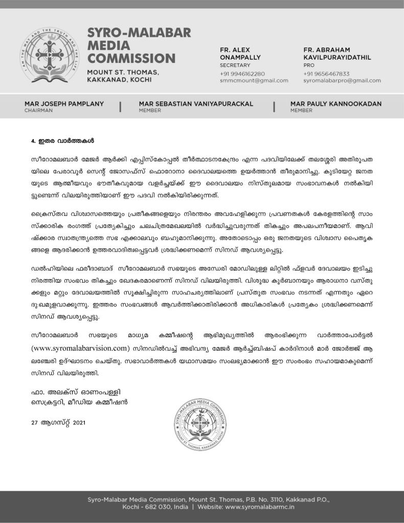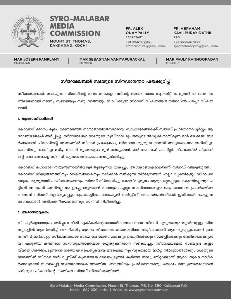 Syromalabar Post Synodal Press Release August 2021