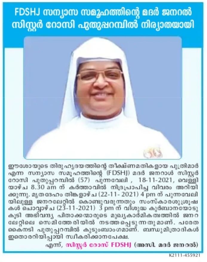 News: Very Rev. Sr. Rosy Puthuparambil FDSHJ, the present Superior General of Fervent Daughters of Sacred Heart of Jesus (FDSHJ) has been called for his eternal reward this morning (19-11-2021)