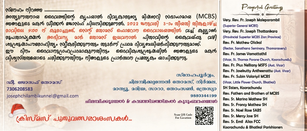 Priestly Ordination of Dn Joseph Chilambikunnel MCBS | Invitation