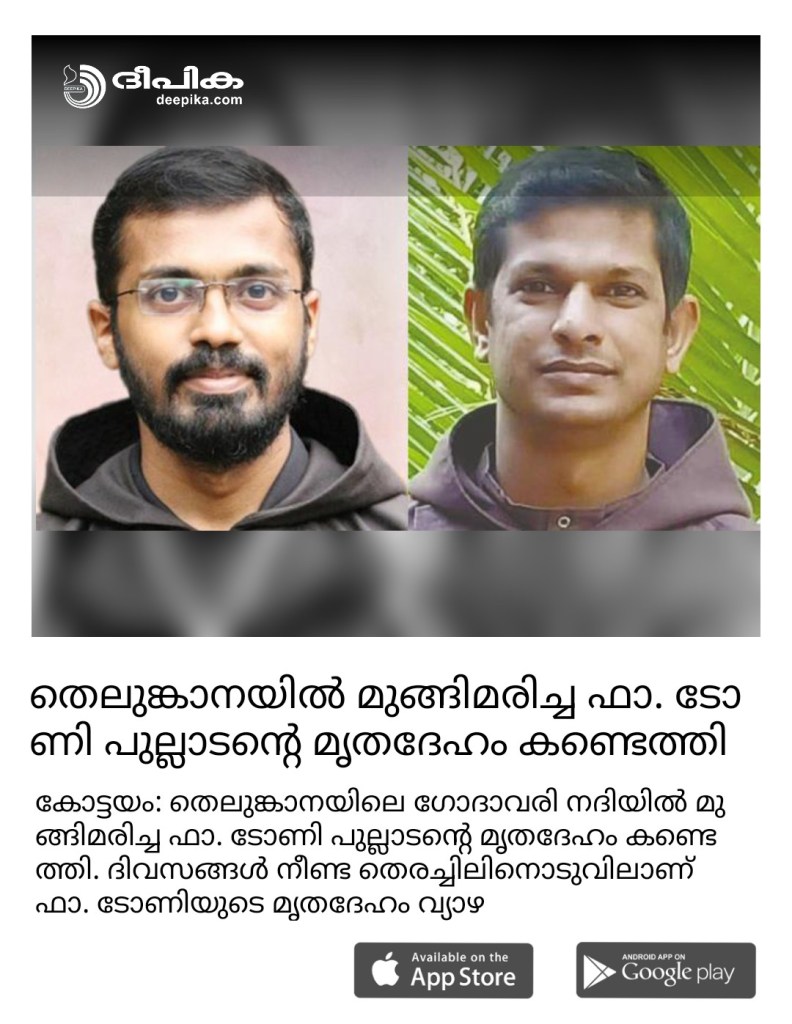 കോട്ടയം: തെലുങ്കാനയിലെ ഗോദാവരി നദിയിൽ മുങ്ങിമരിച്ച ഫാ. ടോണി പുല്ലാടന്റെ മൃതദേഹം കണ്ടെത്തി. ദിവസങ്ങൾ നീണ്ട തെരച്ചിലിനൊടുവിലാണ് ഫാ. ടോണിയുടെ മൃതദേഹം വ്യാഴാഴ്ച രാത്രി 11-നു കണ്ടെത്തിയത്.