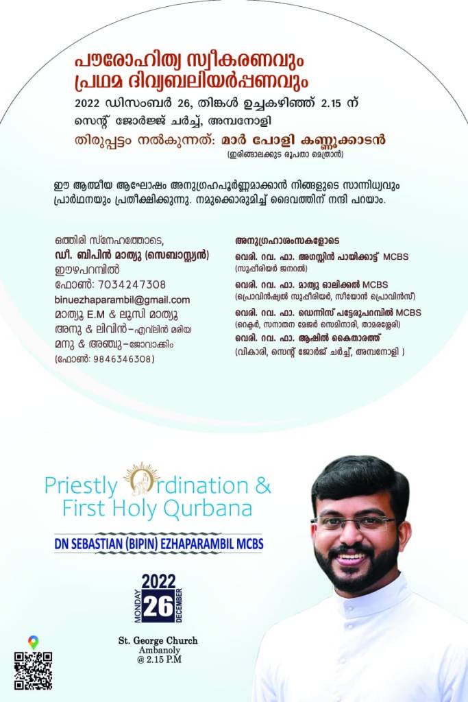 Priestly Ordination and First Holy Qurbana of Dn Bibpin Ezhaparambil MCBS