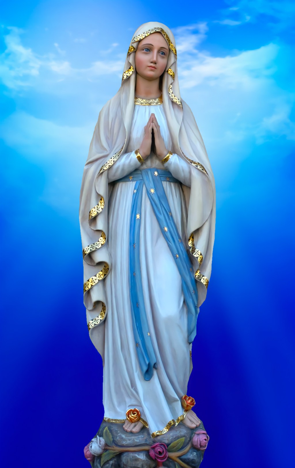 ബെർണ്ണദീത്ത വിസ്മയത്തോടെയും പകപ്പോടെയും കണ്ണെടുക്കാതെ നോക്കിനിന്നു. പൊന്നൊളി പരത്തുന്ന ആ ദർശനത്തിലെ സ്ത്രീ, നല്ല മൃദുവെള്ളവസ്ത്രവും വീതിയുള്ള നീല അരപ്പട്ടയും മുടി ഭൂരിഭാഗവും മറയ്ക്കുന്ന വെള്ള ശിരോവസ്ത്രവും ധരിച്ചിരുന്നു.നീലനിറത്തിലുള്ളതും കരുണ വഴിയുന്നതുമായ കണ്ണുകൾ.. സുവർണ്ണറോസാ പുഷ്പങ്ങൾ അവളുടെ പാദാരവിന്ദങ്ങളിൽ തിളങ്ങി. അവൾ ബെർണ്ണദീത്തയെ നോക്കി പുഞ്ചിരിച്ച് അടുത്ത് ചെല്ലാൻ പറഞ്ഞു.