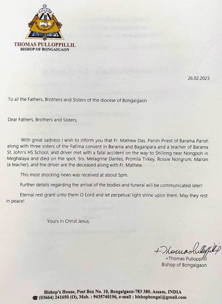 The dead have been identified, Fr. Mathew Das, Parish Priest and Principal St. John’s HS School, Barama, Sr. Melamine Dantes, Sr. Promila Tirkey, Sr.Rossie Nongrum, Mairan (Teacher) and the Driver. The bodies have been taken to Nongpho Civil hospital for Post-mortem.