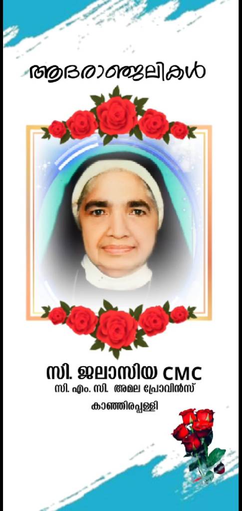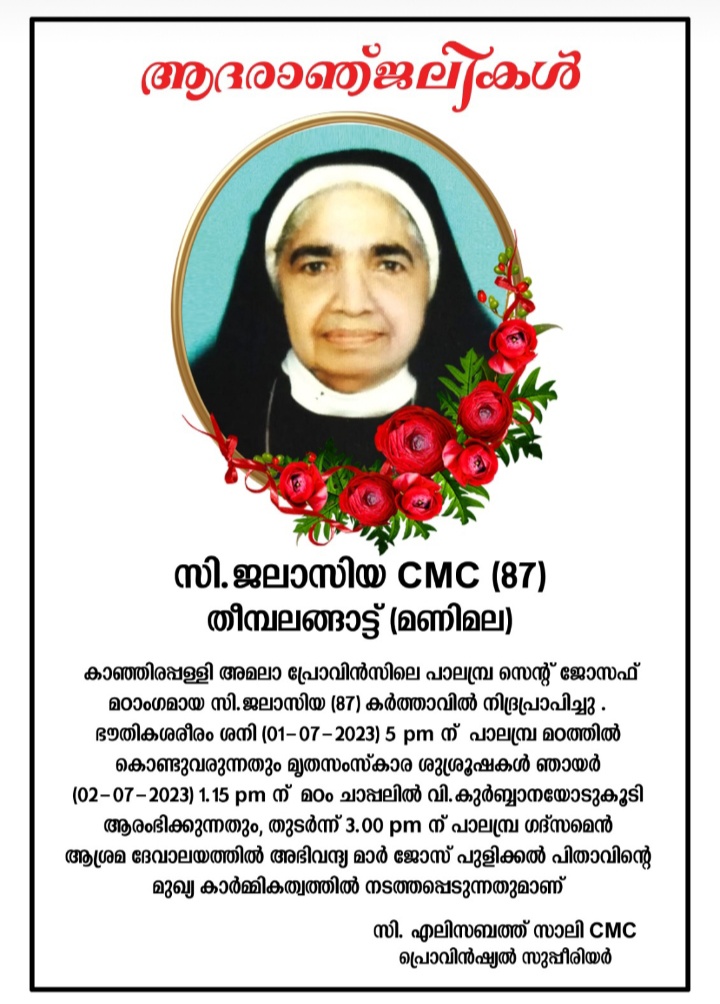 RIP 🙏🙏 കാഞ്ഞിരപ്പള്ളി അമല പ്രൊവിൻസിലെ പാലമ്പ്ര സെന്റ് ജോസഫ് മഠാoഗമായ സി. ജലാസിയ (87) കർത്താവിൽ നിദ്ര പ്രാപിച്ചു. മൃതസംസ്കാരം ഞായർ( 2/7/2023 ) ഉച്ചകഴിഞ്ഞ് പാലമ്പ്ര ഗദ്സമെൻ ആശ്രമ ദേവാലയത്തിൽ നടത്തപ്പെടുന്നതാണ്. അമ്മയുടെ ആത്മശാന്തിക്കായി പ്രാർത്ഥിക്കാം. 🙏🙏