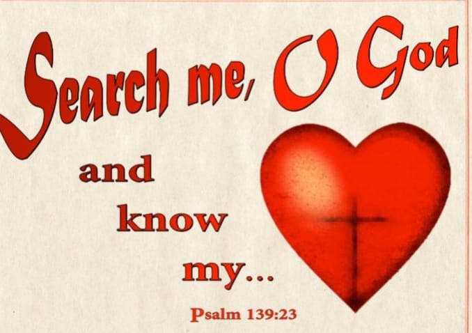 ” ദൈവമേ എന്നെ പരിശോധിച്ച് എന്റെ ഹൃദയത്തെ അറിയണമേ. എന്നെ പരീക്ഷിച്ച് എന്റെ വിചാരങ്ങൾ മനസ്സിലാക്കണമേ, വിനാശത്തിന്റെ മാർഗ്ഗത്തിലാണോ ഞാൻ ചരിക്കുന്നതെന്ന് നോക്കണമേ. ശാശ്വതമാർഗ്ഗത്തിലൂടെ എന്നെ നയിക്കണമേ ” (സങ്കീ. 139.23-24).