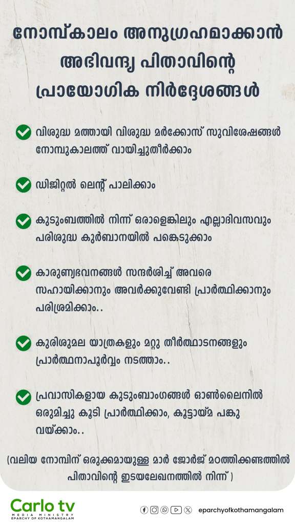 വലിയ നോമ്പ് അനുഗ്രഹ ദായകമാക്കാൻ ലളിതവും പ്രായോഗികവുമായ നിർദ്ദേശങ്ങൾ നൽകി മാർ ജോർജ് മഠത്തിക്കണ്ടത്തിൽ പിതാവ്…