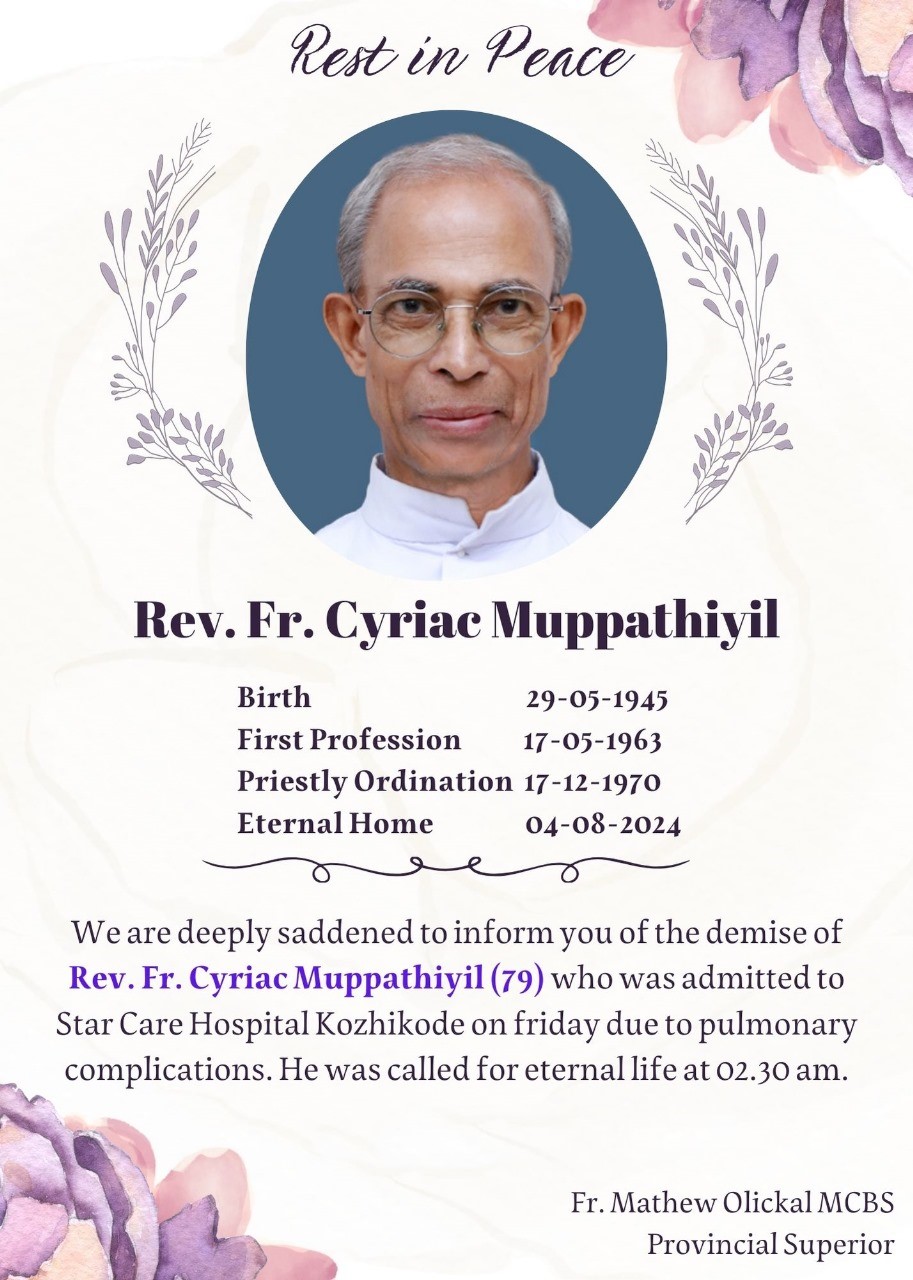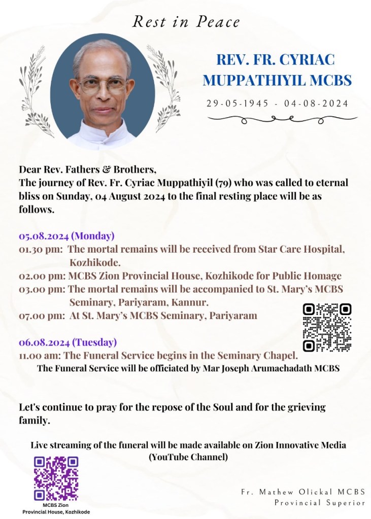 The journey of Rev. Fr. Cyriac Muppathiyil (79) who was called to eternal bliss on Sunday, 04 August 2024 to the final resting place will be as follows.