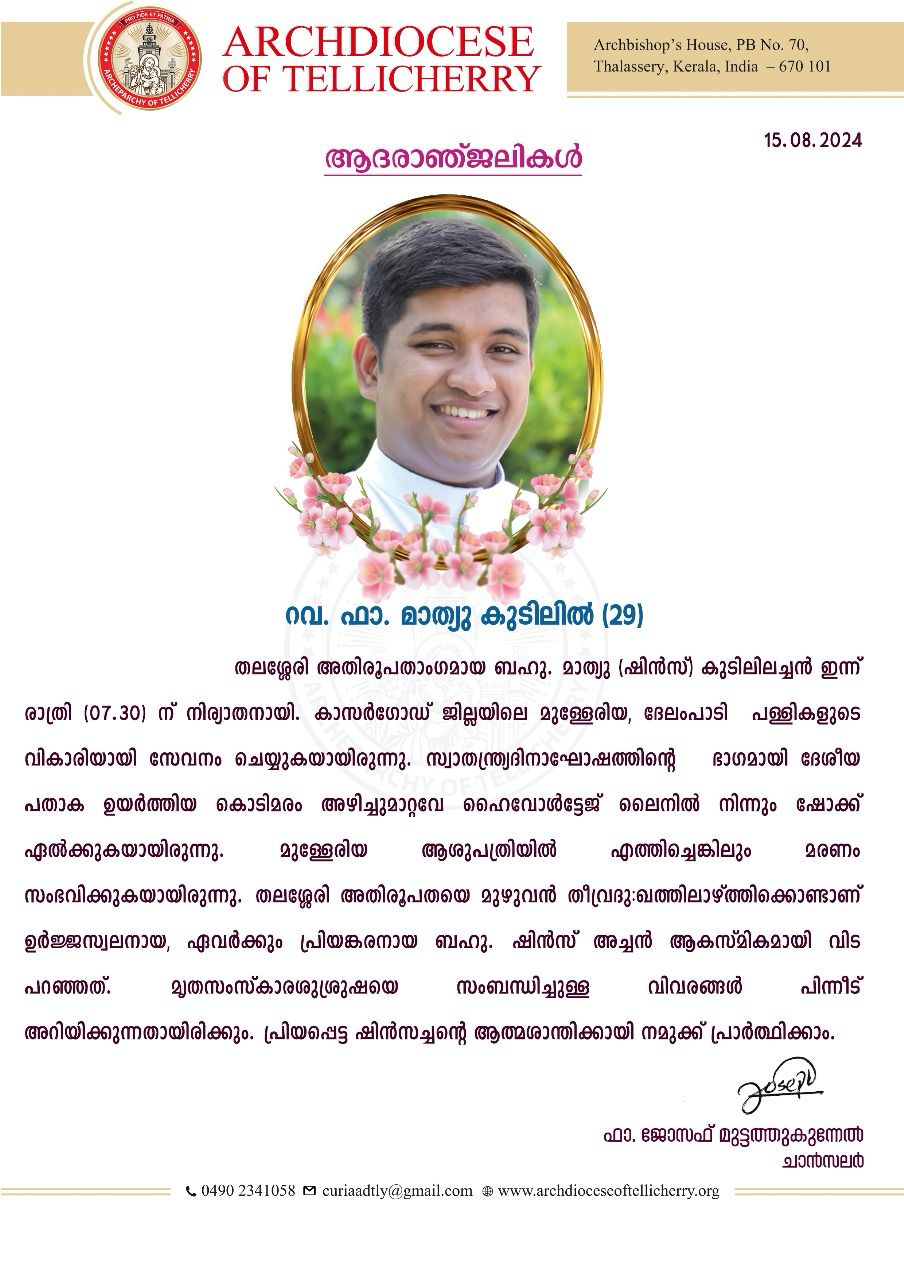 പ്രിയപ്പെട്ടവരെ വളരെ സങ്കടകരമായ ഒരു വാർത്ത: തലശ്ശേരി അതിരൂപതയിലെ മുള്ളേരിയ പള്ളി ഇടവക വികാരി ബഹുമാനപ്പെട്ട ഷിൻസ് കുടിലി അച്ചൻ ഏതാനും മണിക്കൂറുകൾക്കു മുമ്പ് മരണമടഞ്ഞു. വൈകുന്നേരം ദേശീയ പതാക താഴ്ത്തുന്ന സമയത്ത് ദേശീയ പതാകയുടെ കമ്പി കരണ്ട് കമ്പിയിൽ തട്ടി ഷോക്കേറ്റ് ആകസ്മികമായി നമ്മളിൽ നിന്നും വേർപെട്ടുപോയി. അച്ചൻ്റെ ആത്മാവിനു വേണ്ടിയും അച്ചൻ്റെ വേർപാടിൽ വേദനിക്കുന്ന പ്രിയപ്പെട്ടവർക്കുവേണ്ടിയും നമുക്ക് പ്രാർത്ഥിക്കാം….🙏🏽💐