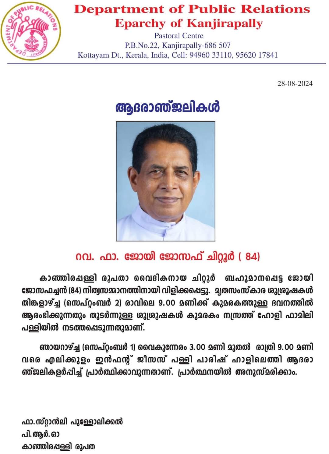 ചിറ്റൂർ ബഹുമാനപ്പെട്ട ജോയി അച്ചൻ നിത്യസമ്മാനത്തിനായി വിളിക്കപ്പെട്ടു. പ്രാർത്ഥനയിൽ അനുസ്മരിക്കാം. 🙏🙏