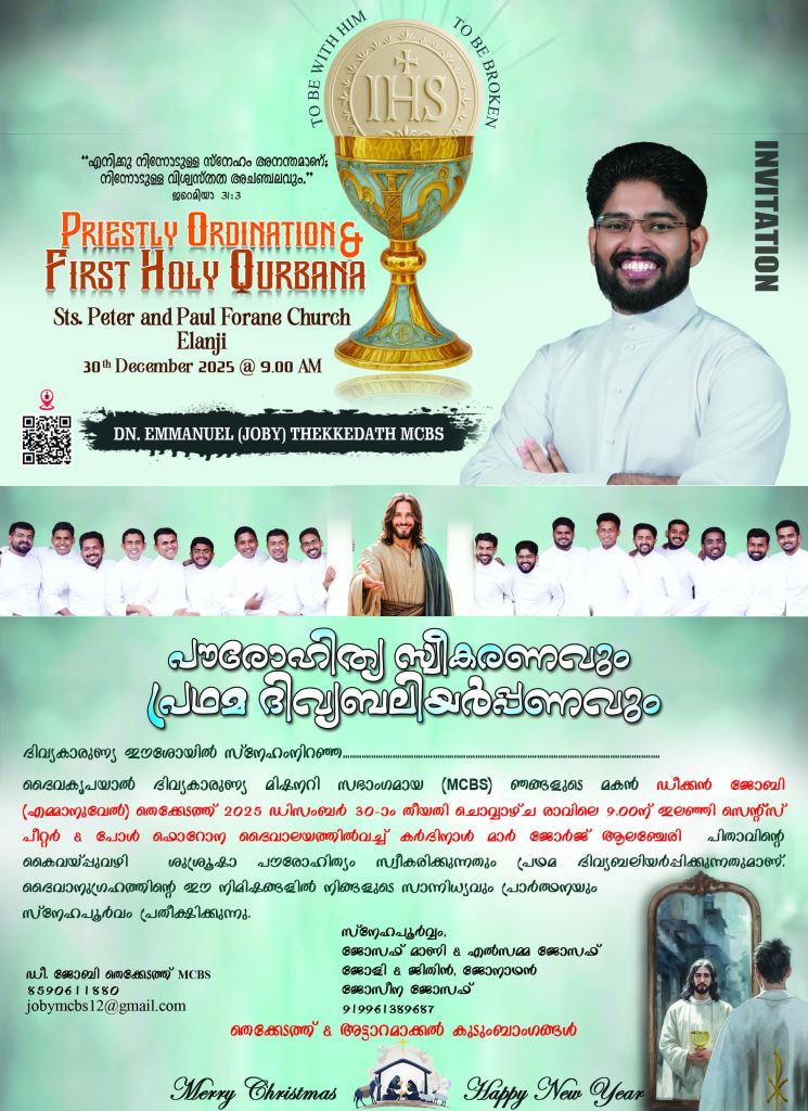 ദൈവകൃപയാൽ ദിവ്യകാരുണ്യ മിഷനറി സഭാംഗമായ (MCBS) ഡീക്കൻ ജോബി (എമ്മാനുവേൽ) തെക്കേടത്ത് 2025 ഡിസംബർ 30-ാം തീയതി ചൊവ്വാഴ്ച രാവിലെ 9.00ന് ഇലഞ്ഞി സെന്റ്റ്സ് പീറ്റർ & പോൾ ഫോറോന ദൈവാലയത്തിൽവെച്ച് കർദിനാൾ മാർ ജോർജ് ആലഞ്ചേരി പിതാവിൻ്റെകൈവെയ്പ്പുവഴി ശുശ്രൂഷാ പൗരോഹിത്യം സ്വീകരിക്കുന്നതും പ്രഥമ ദിവ്യബലിയർപ്പിക്കുന്നതുമാണ്. ദൈവാനുഗ്രഹത്തിന്റെ ഈ നിമിഷങ്ങളിൽ നിങ്ങളുടെ പ്രാർത്ഥന സ്നേഹപൂർവം അപേക്ഷിക്കുന്നു.