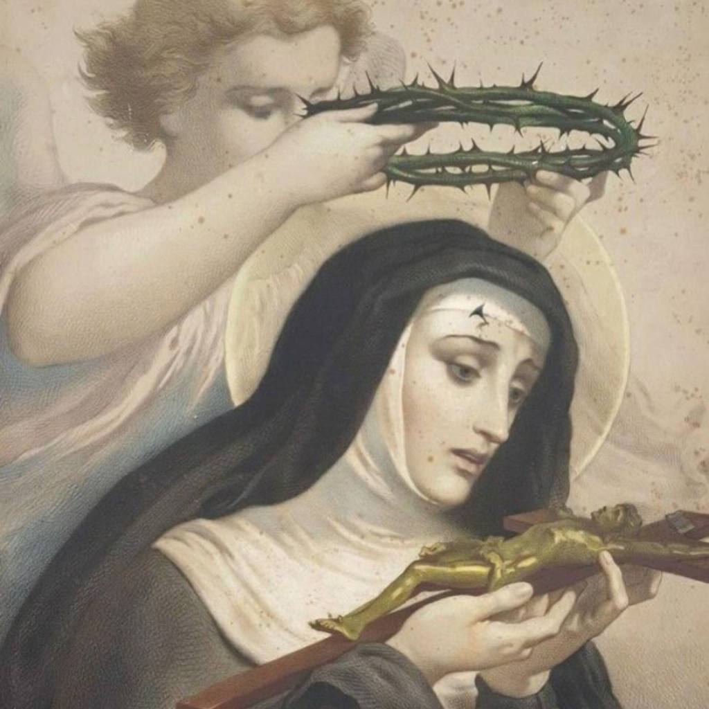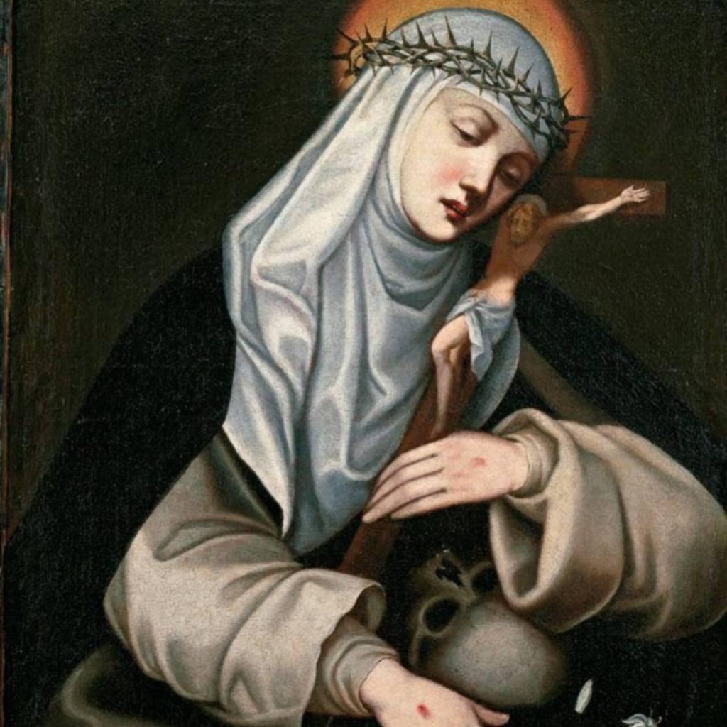 Catherine was a 14th-century Dominican tertiary who led a deep life of prayer and contemplation. During her life she received the wounds of Christ after receiving Holy Communion, and they were at first visible. However, she petitioned God that the grace be made invisible, so that she could still participate in the suffering of Christ but remain hidden to the world.