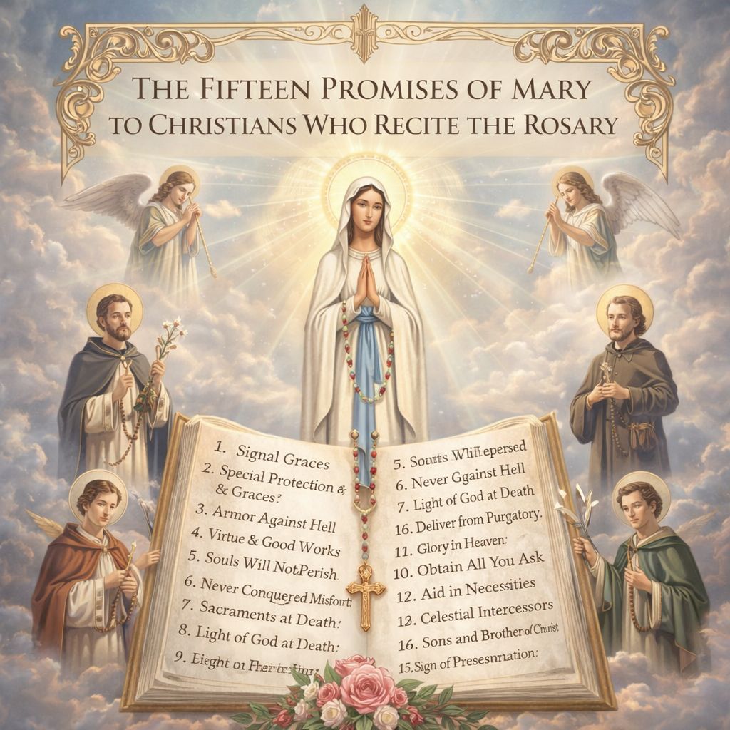 These promises are not magical guarantees, but graces offered to those who sincerely pray the Rosary with devotion, perseverance, and meditation on its mysteries.