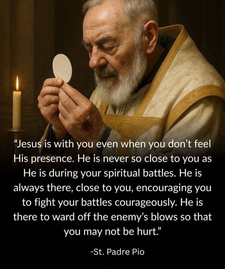 “Jesus is with you even when you don’t feel His presence. He is never so close to you as He is during your spiritual battles. He is always there, close to you, encouraging you to fight your battles courageously. He is there to ward off the enemy’s blows so that you may not be hurt.”