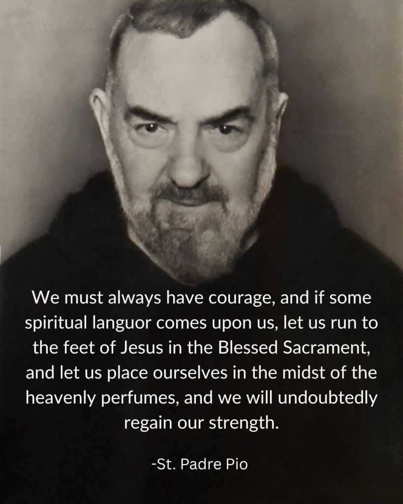 We must always have courage, and if some spiritual languor comes upon us, let us run to the feet of Jesus in the Blessed Sacrament, and let us place ourselves in the midst of the heavenly perfumes, and we will undoubtedly regain our strength.